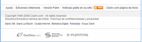Por último, en este elemento de cierre es donde suele reflejarse la autoría de un medio y la información institucional. En este caso, se enlaza a las “Normas de confidencialidad y privacidad” y se explicita el copyright de Clarín sobre sus contenidos (1996-2008) y el nombre de la Directora, Ernestina Herrera de Noble, viuda del fundador del diario impreso.