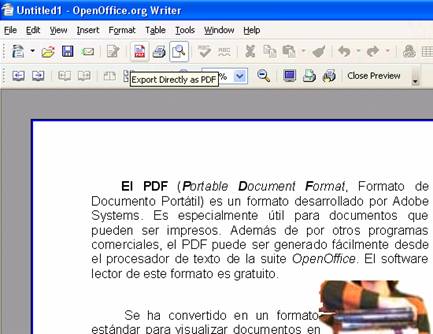 Detalle de OpenOffice Writer, con el icono de conversión a formato PDF activado