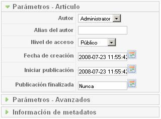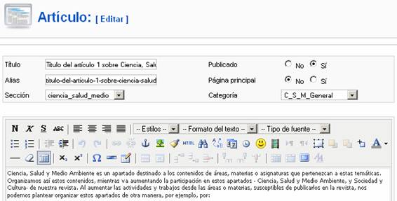 para crear cada artículo. Debemos indicar el Título, Sección y Categoría. El Alias lo pone el programa por defecto. Bajo estas etiquetas, hay un procesador de texto para editar el artículo.