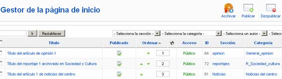 De todos nuestros artículos, seleccionamos algunos para poner en la página principal o portada de nuestro periódico o revista. Para ello, en la columna Publicado pulsamos en