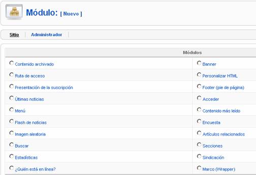 Elegimos la opción Nuevo y seleccionaremos el nuevo módulo Acceder, destinado al acceso para los usuarios registrados.