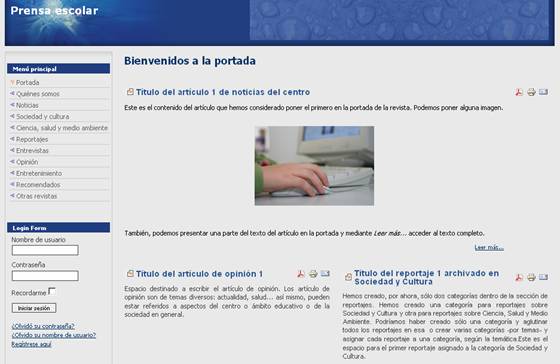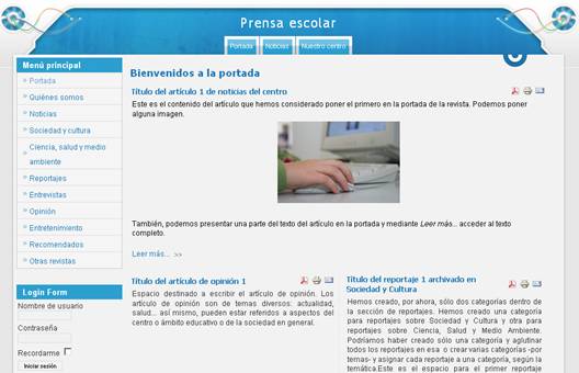 De este modo, podemos determinar la apariencia que consideremos más adecuada para nuestra prensa escolar. Bien, podemos elegir la anterior –aunque no permite presentar el menú superior-, la que hemos presentado al principio –plantilla siteground-j15-5 - u otra que consideremos más adecuada.