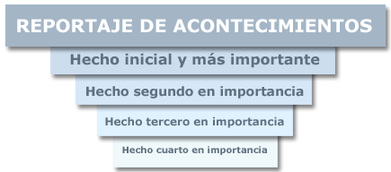 | a.- De acontecimientos: Visión estática de los hechos como algo terminado. El periodista es un observador que escribe desde fuera del acontecimiento. Es especialmente eficaz para la descripción ya que los hechos se presentan de modo simultáneo. Estos se agrupan por orden de importancia. En cada párrafo se desarrolla un hecho, de modos que se puede ampliar o acortar con relativa facilidad en caso de que fuera necesario. |