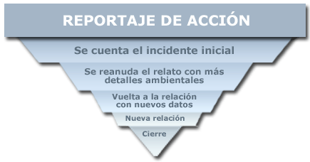 | b.- De acción. Visión dinámica de los hechos como algo que está ocurriendo. El periodista sigue el ritmo de la evolución ya que escribe desde dentro del acontecimiento. Es un modelo recomendado para la narración. El relato sigue la evolución temporal del acontecimiento. Además, no sólo aparecen hechos sino incidentes, descripciones de los protagonistas, etc. En la introducción se sintetiza la esencia de la noticia, se van añadiendo detalles y se amplía lo reseñado inicialmente. |
