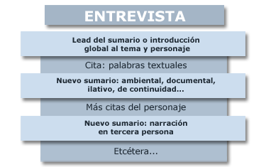 | c.- De citas. Es lo que conocemos comúnmente como entrevista. Se alternan las palabras textuales del personaje interrogado con descripciones o narraciones por parte del periodista. Es una de las manifestaciones periodísticas de mayor aceptación popular, sobre todo en el ámbito latino, ya que posee una apariencia de calor humano propio y una sensación de inmediatez. La técnica de realización de la entrevista responde a criterios muy personales ya que según el gran entrevistador Manuel del Arco, es una conversación llevada a la letra impresa y para conversar no hay unas normas establecidas. Sin embargo sí que se considera aconsejable seguir ciertos criterios como guiar el diálogo sin forzarlo, animar al interlocutor pero intercalar las preguntas que interesan, tener naturalidad en el sentido de no hacer preguntas desconcertantes o exhibir en exceso el material que se utiliza para tomar notas. |