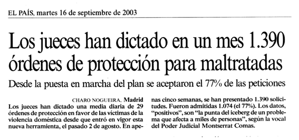A veces ocurre que lo verdaderamente interesante está en las cifras, lo que obliga al lector a leer hasta el final para ver cómo acaba todo. "Los jueces han dictado una media de 29 órdenes de protección a favor de las víctimas de la violencia doméstica desde que entró en vigor la nueva herramienta, el pasado 2 de agosto. En apenas cinco semanas, se han presentado 1.390 solicitudes. Fueron admitidas 1.074 (el 77%). Los datos "positivos", son "la punta del iceberg de un problema que afecta a miles de personas!, según la vocal del Poder Judicial Montserrat Comas. |