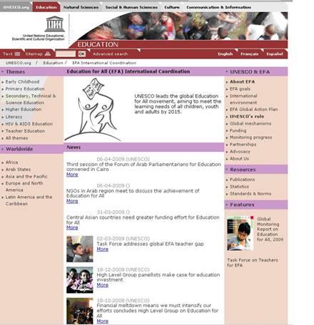 Página de la UNESCO sobre la Educación para Todos. Fuente: http://www.unesco.org/education/efa