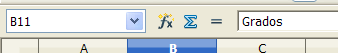 Observa la Barra de fórmulas de la parte superior de la pantalla. El nombre de la celda figura a la izquierda: B11, y su contenido en el centro, en la llamada línea de entrada de fórmulas: Grados.
