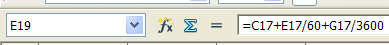 Señala ahora la celda E9, o la C17 y comprobarás que contienen números. Sin embargo, si señalas la celda E11, su contenido verdadero es =ENTERO((E9-C11)*60) tal como puedes leer en la línea de fórmulas. Sin embargo, lo que se ve en la celda es 46'.