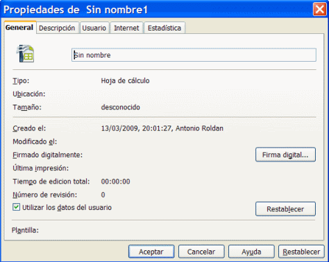 En el menú Archivo encontrarás muchas opciones interesantes, que iremos viendo a lo largo del curso, pero hay una que casi nadie visita, y es la de Propiedades. En ella puedes leer las características de tu archivo, añadirle un título, comentarios, etc. para que cuando lo abras pasados unos meses, sepas de qué trataba o cuánta memoria ocupa.