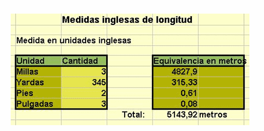 Los datos de entrada serán cuatro, del tipo 3 millas, 345 yardas, 2 pies y 3 pulgadas y el resultado del cálculo será su equivalente en metros, en este caso 5143,9158 m.
