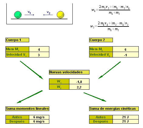 El segundo ejercicio consistirá en analizar, mediante una ruta de resolución y una comprobación posterior, el comportamiento de dos cuerpos en un choque elástico frontal. Si se te ha olvidado la teoría, abre los apuntes sobre el tema que están contenidos en el archivo elastico.ods. En ellos puedes consultar todas las fórmulas y propiedades.