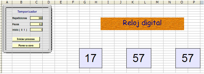 Para que funcione la simulación de un reloj digital, lo único fundamental que has de decidir es cómo rellenar las tres celdas con fórmulas usando las funciones AHORA(), HORA(), MINUTO() Y SEGUNDO(). Es fácil y no te damos pistas. En lenguaje coloquial sería "minuto de ahora mismo", "segundo de ahora mismo"...Si ahora decides las repeticiones del temporizador y pulsas sobre Iniciar Proceso, observarás la animación de un reloj digital. A veces podrá saltar dos segundos en lugar de 1.