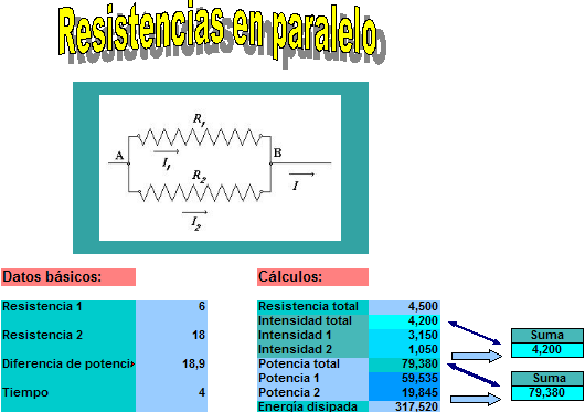- La potencia disipada en forma de calor en cada resistencia es equivalente al producto de la misma por el cuadrado de la intensidad que la recorre. La energía se hallará como el producto de la potencia por el tiempo. Podrá venir dada en julios, y con el factor 0,24 en calorías.
