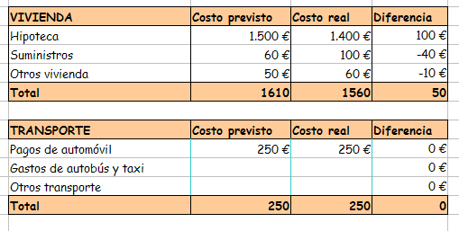 Imagina una familia que está preocupada por una situación inesperada de merma de ingresos. Se plantean confeccionar un presupuesto mensual de gastos, anotando tanto los previstos como los reales, para medir su capacidad de ahorro.