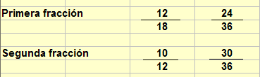 - Después dividimos ese m.c.m. entre los denominadores y los multiplicamos por los numeradores. En este caso nos dará 36/18*12 = 24 y 36/12*10 = 30.