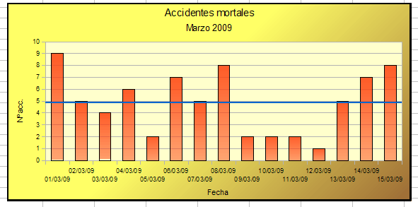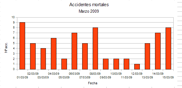 La siguiente tabla contiene los datos provisionales del número de accidentes mortales ocurridos en España desde el 1-3-2009 hasta el 15-3-2009 (Fuente: DGT)