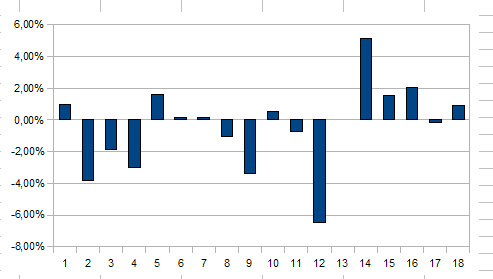 y después dar a esa celda el formato de porcentaje con dos decimales (recuerda: Formato > Celdas... Pestaña Número). Hazlo y te resultará un incremento negativo del -0,99%. Arrastra esa fórmula hacia abajo y conseguirás el resto de porcentajes.