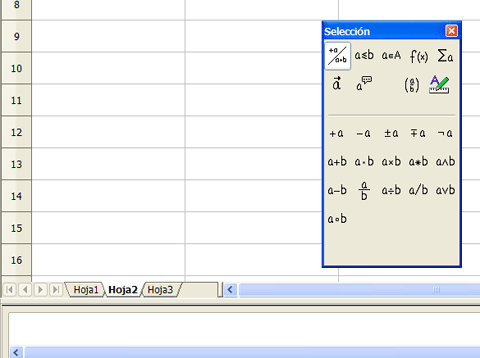 En el primer caso se abrirá el Editor de Fórmulas. Observa en la figura que contiene dos visores, el superior, que es la misma hoja de cálculo que estás usando y que contendrá el diseño de la fórmula, y el inferior, en el que van apareciendo los códigos internos que usa OpenOffice.org en el editor. Debe abrirse también la ventana de Selección. Si no lo hiciera, pide Ver > Selección.