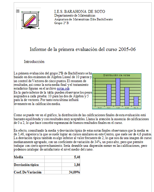 Como ejemplo de integración de herramientas y objetos de OpenOffice.org estudiaremos un Informe sobre una Evaluación de Matemáticas de Bachillerato basado en las calificaciones contenidas en el modelo notas.ods.