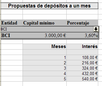 El escenario propiamente dicho lo constituyen las nueve celdas que poseen un fondo gris oscuro. En ellas están contenidas las tres propuestas de depósito mensual, aunque sólo se vea la de Mistal Seguros. Pulsa sobre la pequeña flecha que contiene el escenario y obtendrás una lista con las tres ofertas: BCI, Cajamed y Mistal Seguros. Elige cualquiera de ellas y cambiarán los importes de los intereses recibidos que figuran en la parte inferior. Practica un poco con estos cambios de escenario.