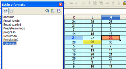 Estilos para anotar en el calendario: Se puede querer destacar los días del plan de adelgazamiento mediante algún estilo. Hemos incluido tres: Anotado, si sólo se desea anotar que ese día se tomó nota del peso, y Progreso o Retroceso según se cumpla el plan previsto. Para destacar una fecha la seleccionas y después pides Formato - Estilo y Formato. En el catálogo que obtienes marca el estilo deseado y pulsa con doble clic. Así se destacará ese día en la forma deseada.