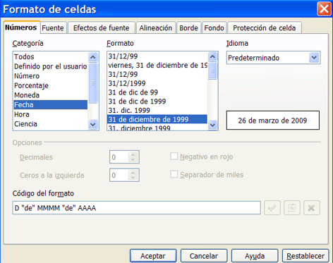Observa la gran cantidad de formatos de fecha que están contenidos en la lista Formato. Cambia el formato de la celda B4 a otro distinto: 31/12/99, 31. dic. 1999, 31/12/1999, etc. Como ves, hay muchas formas de escribir una fecha.