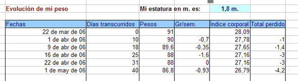 El resto de la tabla se comprende fácilmente. Los gramos perdidos por semana se van calculando de forma proporcional según los días transcurridos.