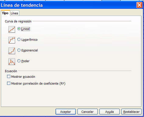 En la pestaña Tipo de la ventana que se abre dispondrás de varios tipos de línea de tendencia. En este caso hemos elegido la Exponencial.