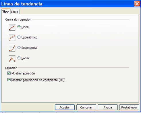 Crea un gráfico de dispersión. Haz doble clic sobre el gráfico y señala la línea que forman los datos y cuando aparezca la nota de Serie (o punto) de datos... abre el menú contextual con el botón derecho del ratón y elige Insertar Línea de tendencia. Abre la pestaña Tipo. Hay cuatro opciones: Lineal, Exponencial, Logarítmica o Potencial.
