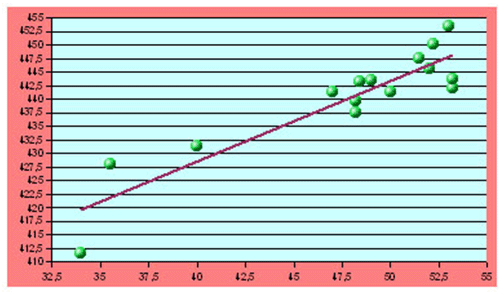 (4) Confecciona un gráfico de puntos de tipo XY para esta situación y le añades posteriormente una línea de regresión lineal (puedes repasar el procedimiento en el apartado de los Contenidos Estadística Bidimensional). Debe quedar parecido a éste: