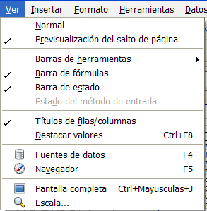 El menú Ver de Calc es similar al de otros programas, pero en la versión 3.1 se ha incorporado la barra de desplazamiento para la escala, por lo que parece conveniente repasarlo.