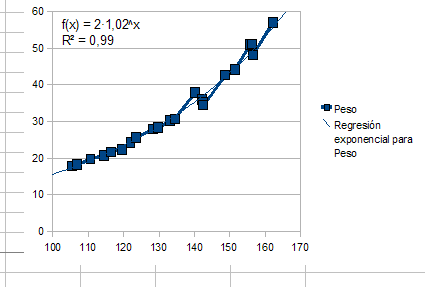 (c) Construye un gráfico de dispersión XY entre talla y peso de toda la tabla (sin previos filtrados) e insértale una línea de tendencia exponencial en la que aparezca ecuación y valor de R2. Copia y pega este gráfico en el documento de Writer que has creado.