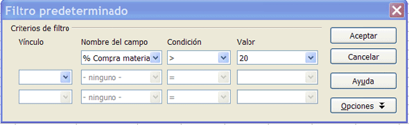 Para organizar el filtrado buscaremos en Nombre del campo el % en gasto de material, en Condición el signo > y como valor el 20. Con esta operación obtendremos el filtrado de la tabla a valores de ese campo superiores a 20: