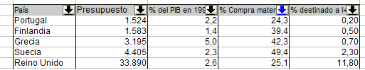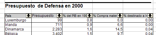 Por ejemplo, si deseas saber qué países gastan el 0,08% de su PIB, pulsa la flechita del campo % del PIB en 1999 y elige 0,08. Obtendrás dos países: Austria y Luxemburgo. Para anular el filtro, en el mismo campo elige Todos. Prueba también a filtrar los 10 primeros en algún campo.
