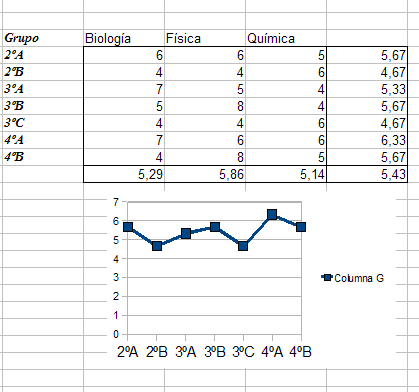 Añade promedios en filas y columnas y confecciona un gráfico de promedios para los distintos cursos. Guárdalo todo. La siguiente imagen te ayudará: