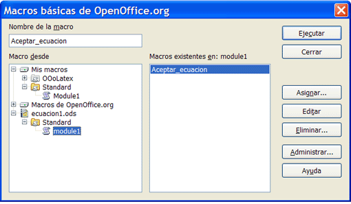 Usa la secuencia Herramientas > Macros > Organizar macros > OpenOffice.org Basic. No entres en otra ruta. Al llegar aquí, busca ecuación1.ods, expande todas sus subcarpetas y selecciona module1. Descubrirás que contiene una macro que se llama Aceptar_ecuacion