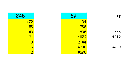 Después deberemos duplicar el 67 (por ejemplo) y dividir por la mitad el 345. Para ello crearemos tres columnas como las siguientes, que iremos explicando una a una: