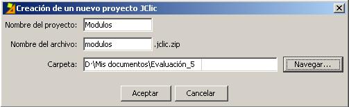 Con JClic author crearemos un nuevo proyecto. Esta vez le llamas modulos (por lo tanto se guardará con el nombre modulos.jclic.zip).