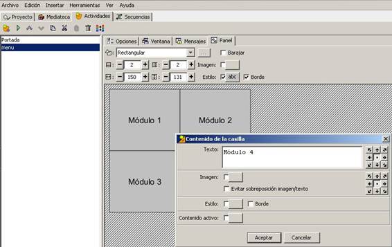 Abre el proyecto modulos.JClic.zip con Jclic Autor. Ahora habrá que definir los saltos desde las casillas de la actividad Menú a cada uno de los proyectos de los módulos.