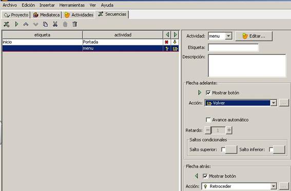 El paso siguiente será ajustar el funcionamiento de las flechas de avanzar y retroceder. Las acciones posibles son: Avanzar (o retroceder), Detenerse (el botón queda inactivo), Saltar a una etiqueta, Volver al lugar desde donde se hizo el último salto, o Salir de JClic: