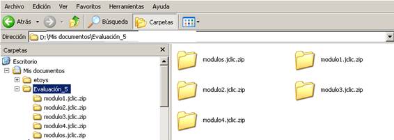 Ahora tendrás que copiar en la carpeta "Evaluacion_5" los archivos .jclic.zip de las prácticas de los anteriores módulos.