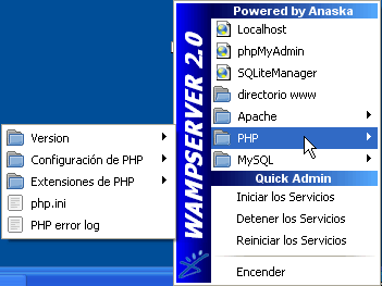 Si haces clic con el botón derecho del ratón, sobre este icono se despliega un menú que nos permite decidir el idioma que utilizará WAMP. Elegimos "spanish" si así es nuestro deseo.