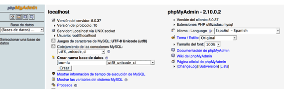 Joomla! permite que el cotejamiento, juego de caracteres, que utilicen las bases de datos sean "utf8_Unicode", lo que posibilita mayor versatilidad para los idiomas en que pueda estar presentado Joomla! El cotejamiento es importante no sólo en la definición de la base de datos, sino también en las conexiones MySQL que se realicen. Como tenemos libertad, al trabajar en local, de elegir cuál es lo que nos conviene, podríamos decidir la combinación que se ve en la imagen, o bien, si queremos centrarnos en la particularidad de algunos caracteres del castellano, seleccionar como cotejamiento de las conexiones MySQL y en el de la base de datos que vamos a crear "utf8_spanish(2)_ci".