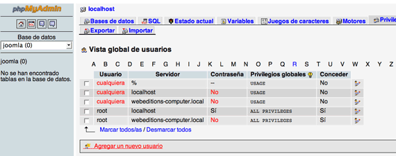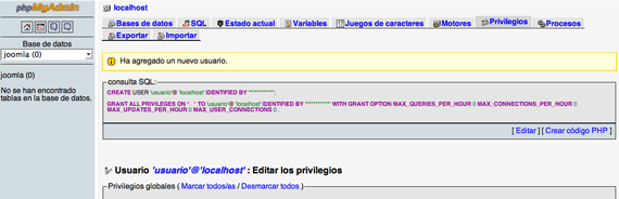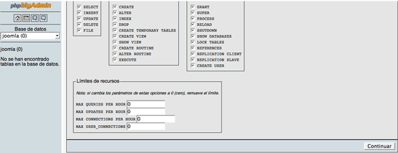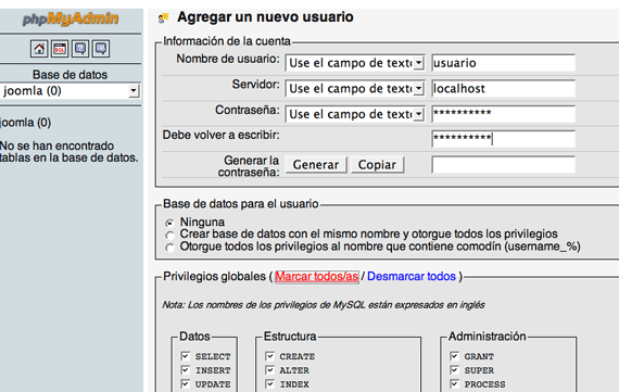 Ahora vamos a crear el usuario que necesitamos para la instalación de Joomla!