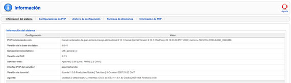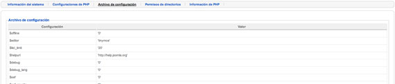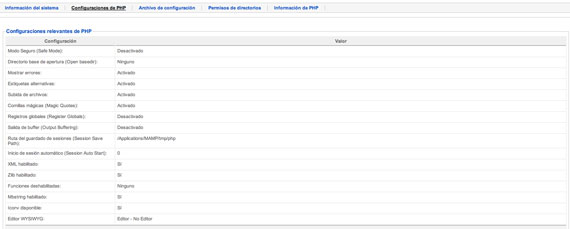 - Configuraciones de PHP. Donde se observan las directivas de PHP activas en el servidor, y que son fundamentales para conocer el grado de compatibilidad del servidor con Joomla!