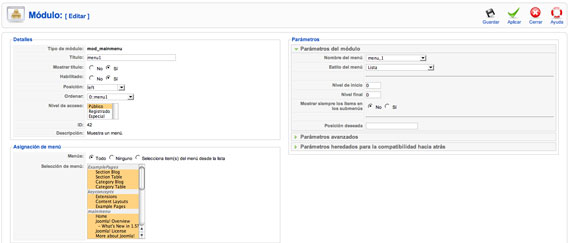 Y lo que significa editar el módulo asociado al menú, que permite muchas más opciones de configuración. La edición de un módulo asociado a un menú se realiza exactamente igual a como se realiza la edición de cualquier módulo instalado en el sistema.