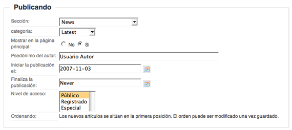 8 Si el usuario "Editor" accede a la ventana de edición de un artículo se encuentra las mismas opciones que un usuario de tipo "Autor", salvo que ahora ya puede ordenar el artículo dentro de los artículos donde se encuentre clasificado.