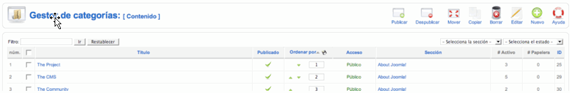 Mover una categoría supone realizar una copia exacta de ella y de los artículos de contenido incluidos, en la sección deseada. Desaparece de la sección original.