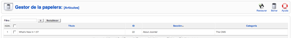 observamos los artículos de contenido que han sido enviados a la papelera, con su Título, ID, y sección y categoría del que procede.